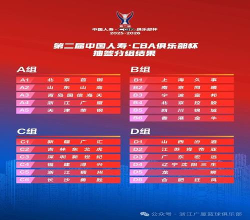北京时间10月17日,第二届中国人寿·CBA俱乐部杯抽签分组结果出炉,浙江广厦篮球俱乐部与北京首钢、山东山高、青岛国信海天以及天津荣钢同处A组。