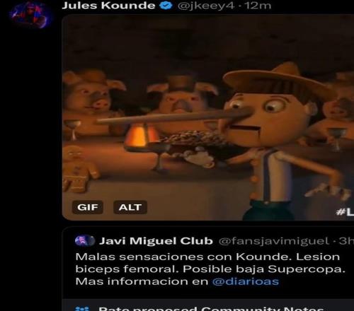 记者称孔德受伤将缺战西超杯,球员社媒发匹诺曹表情回应
