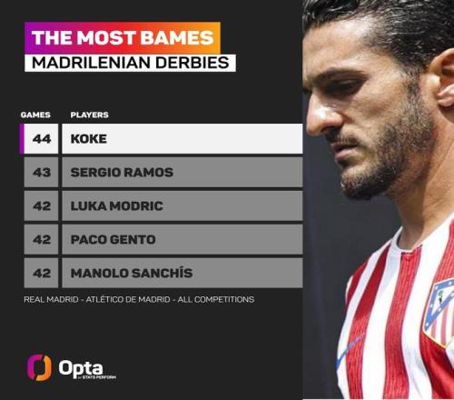 据统计,这使得科克超越前皇马队长拉莫斯,成为出战马德里德比次数最多的球员。