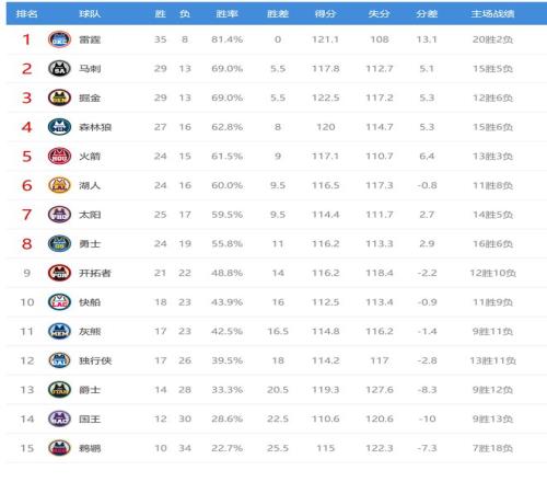 太阳赢球后25胜17负,继续排名西部第七,不过胜场差已经追平了第六的湖人。